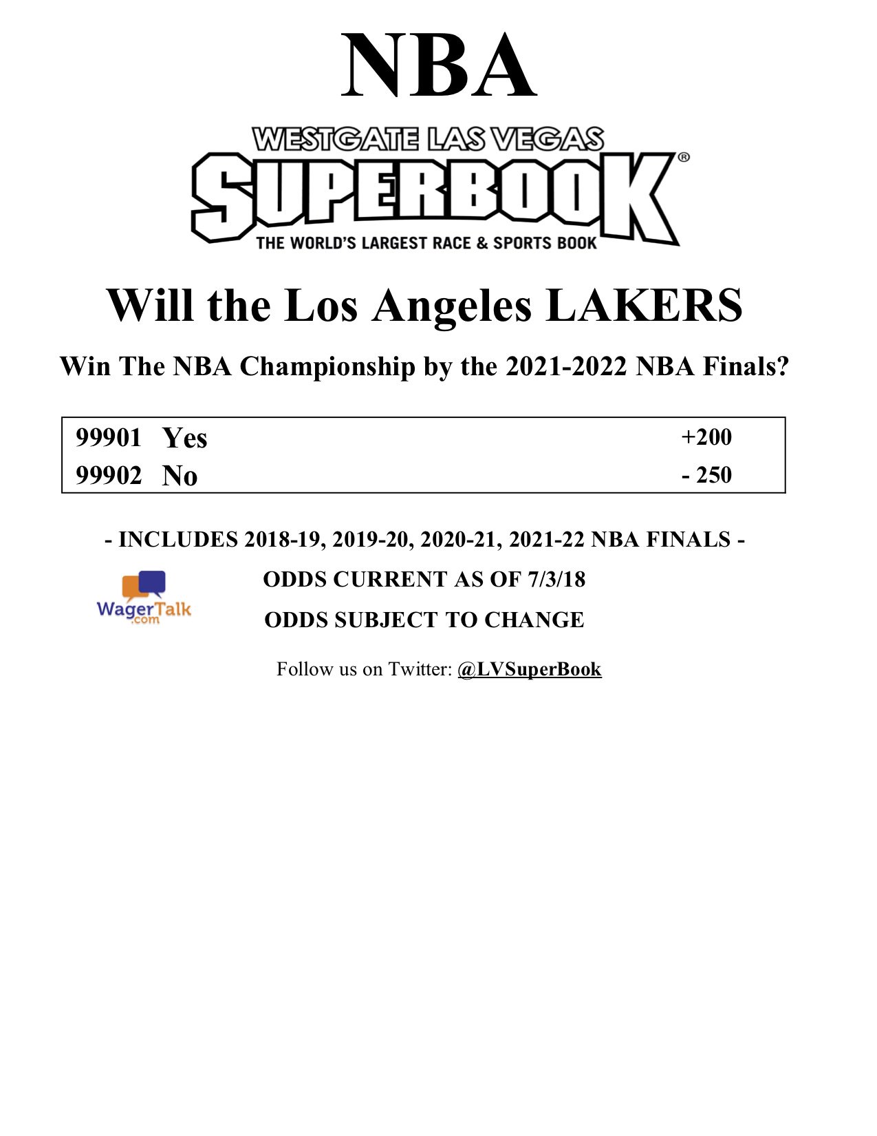 Westgate Odds Of The Lakers Wining A Championship By 2022 Lakers
