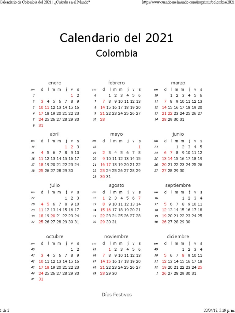 Calendario De Colombia Con Dias Festivos 2020 2021
